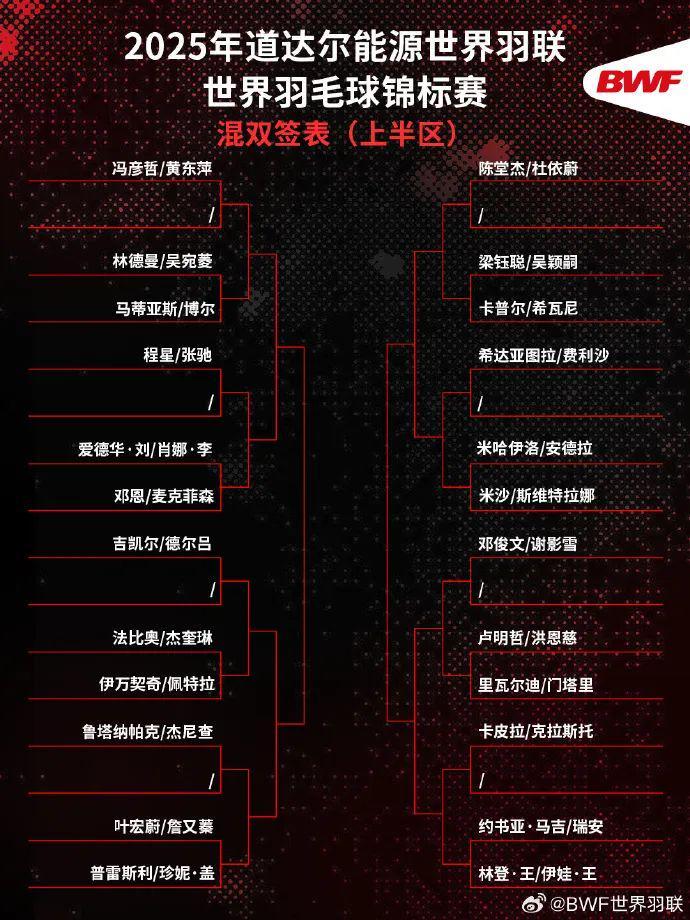 混双方面,国羽共派出4对组合参赛。冯彦哲/黄东萍和程星/张驰同在上半区,冯彦哲/黄东萍在第二轮很有可能遭遇丹麦组合马蒂亚斯/博尔,上一届世锦赛“凤凰”组合正是输给他们。